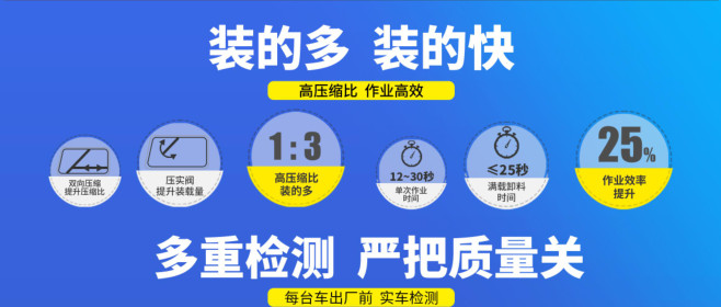 ●采用最新的外置油缸結構和雙向壓縮技術,使用國內國外一流品牌配件,實現壓縮比超過 1:2.5,單次循環≤20 秒,達到了垃圾收集效率的成倍提升。
